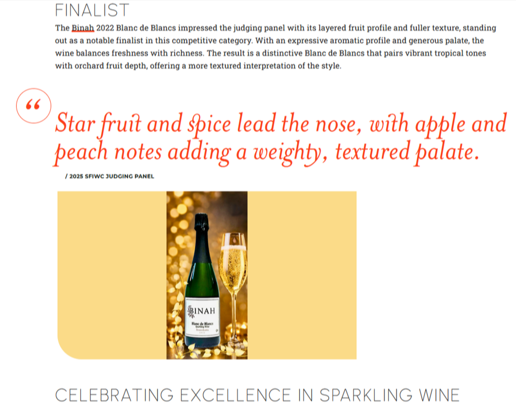 The BINAH 2022 Blanc de Blancs sparkling wine was awarded a Double Gold Medal and 96 Points rating as an “exceptional” finalist for Best Blanc de Blancs at the 2025 San Francisco International Wine Competition, one of the largest and most prestigious wine competitions in the world.